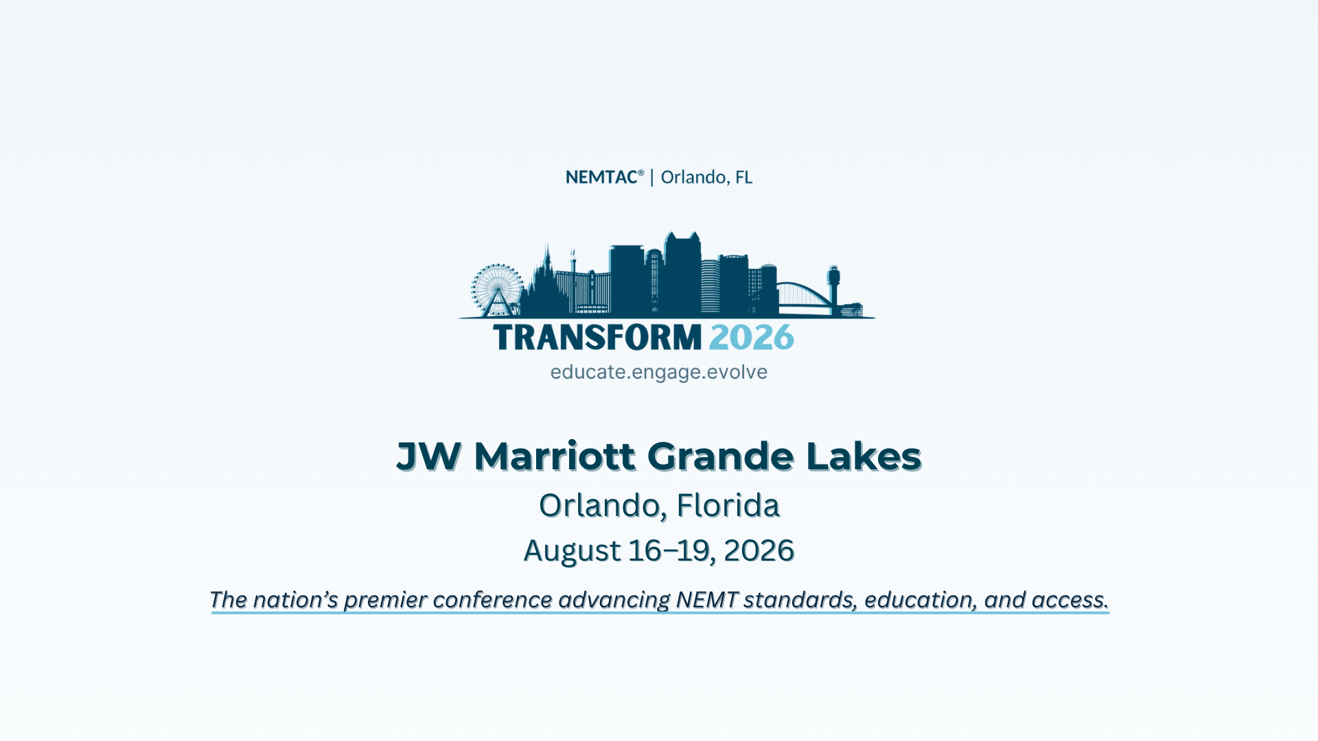 Join us August 16–19, 2026, at the JW Marriott Grande Lakes in Orlando, Florida, for Transform 2026: Educate. Engage. Evolve. This next chapter will expand on our commitment to elevate national standards, strengthen provider and broker networks, and shape the future of NEMT.
